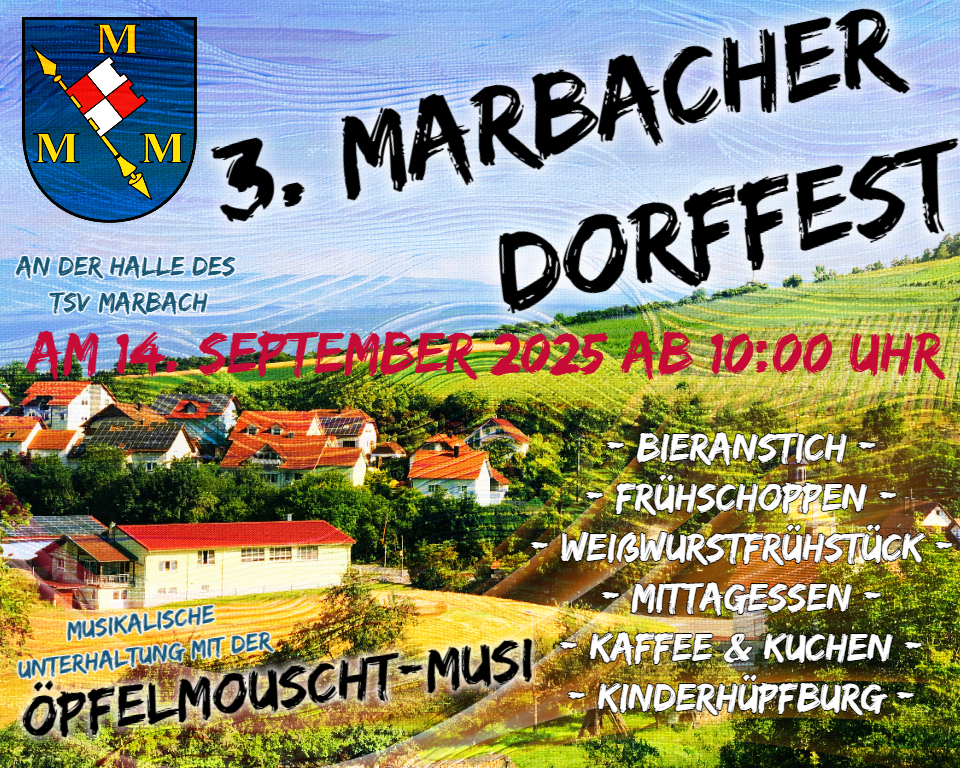Am Wochenende vom 13. und 14. September fand die 3 Auflage des Marbacher Dorffest auf dem Vereinsgelände des TSV Marbach statt. Bereits am Samstag wurde die neue Grillhütte mit dem offizellen Bieranstich durch Bürgermeister Dr. Lukas Braun eingeweiht. Musikalische Unterhaltung bot die Winzerkapelle Beckstein. Am Sonntag startete das Fest mit dem Frühschoppen und einem Weißwurstfrühstück. Nach dem Mittagstisch war im Angebot auch wieder Kaffee und Kuchen, ehe es am Nachmittag Steaks und Würste gab. Musiklisch wurde der Sonntag von der Öpfelmouscht Musi umrandet. Für die kleinen Gäste stand einen Hüpfburg zum austoben bereit.